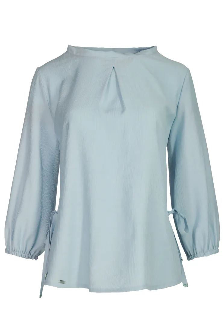 Světle modrá halenka ze splývavé tkaniny přirozeně obtéká postavu a dodává nositele ženský, sebevědomý vzhled. Stojáčkový límec jemně rámuje výstřih s centrálním nařasením, které opticky prodlužuje siluetu. Balonové rukávy jsou stahovány elastickým lemem u zápěstí a doplněny zavazovacím páskem pro dokonalé přizpůsobení. Volnější silueta zaručuje pohodlí po celý pracovní den bez kompromisů ve vzhledu. Jemně prosvítající tkanina s lehkou strukturou dodává modelu vzdušný charakter vhodný pro kancelář i formální příležitosti. Každý kus je šit ručně v krejčovské dílně v limitovaném počtu do 3 kusů od velikosti.