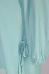 Světle modrá halenka ze splývavé tkaniny přirozeně obtéká postavu a dodává nositele ženský, sebevědomý vzhled. Stojáčkový límec jemně rámuje výstřih s centrálním nařasením, které opticky prodlužuje siluetu. Balonové rukávy jsou stahovány elastickým lemem u zápěstí a doplněny zavazovacím páskem pro dokonalé přizpůsobení. Volnější silueta zaručuje pohodlí po celý pracovní den bez kompromisů ve vzhledu. Jemně prosvítající tkanina s lehkou strukturou dodává modelu vzdušný charakter vhodný pro kancelář i formální příležitosti. Každý kus je vyroben s vysokým podílem ruční práce v krejčovské dílně v limitovaném počtu do 3 kusů od velikosti.