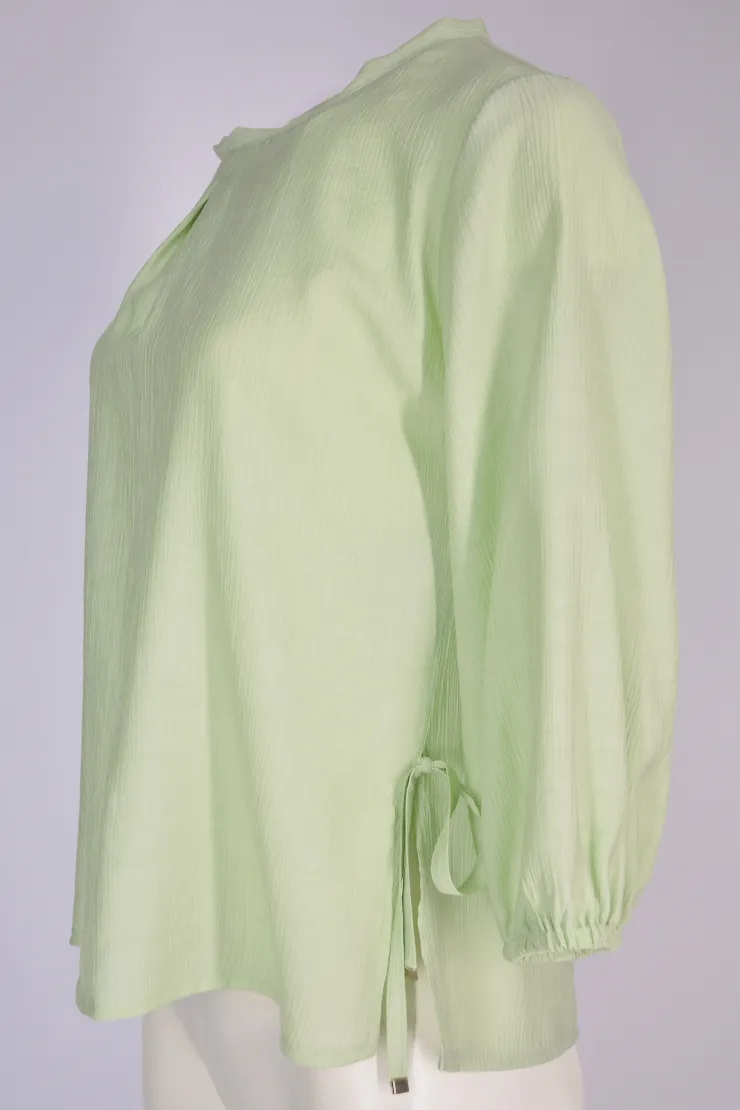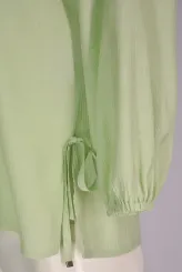 Světle zelená halenka ze splývavé tkaniny přináší pocit lehkosti a sebevědomí po celý pracovní den. Volnější silueta ve tvaru A přirozeně obklopuje postavu a zajišťuje pohodlný, vzdušný střih. Lodičkový výstřih s jemným záhybem uprostřed přední části rámuje dekolt nenápadně a žensky. Balonové rukávy jsou ve spodní části stahovány gumičkou, což vytváří výrazný trojčtvrteční objem. Po obou bocích jsou přišity tkaničky na vázání, které umožňují upravit šířku modelu podle postavy. Halenka je vyrobena ručně v krejčovské dílně v limitovaném počtu do 3 kusů od velikosti.
