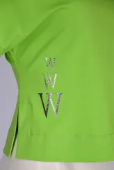 Tato neónově zelená halenka s klasickým límečkem přitahuje pozornost a dodává sebevědomý vzhled po celý den. Volný netopýří rukáv přirozeně obepíná ramena a vytváří vzdušnou, přesto tvarující siluetu. Zkrácený střih zvýrazňuje pas a dodává postavě lehkost a proporcionalitu. Klasický košilový límeček rámuje výstřih a propůjčuje modelu sofistikovaný charakter vhodný do pracovního prostředí. Na boku je diskrétně umístěn opakující se grafický motiv, který oživuje jinak čistou plochu tkaniny. Model je vyroben ručně v krejčovské dílně v limitovaném počtu do 3 kusů od velikosti.