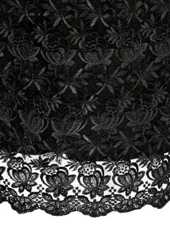 Černé krajkové šaty s jemně průsvitným kulatým výstřihem působí uhlazeně a žensky. Přiléhavý střih přirozeně tvaruje postavu a zvýrazňuje siluetu. Krajkový vzor s květinovým motivem pokrývá celý model a dodává mu výjimečný charakter. Krátké rukávky rámují ramena a zajišťují pohodlný střih vhodný na celý den. Délka ke kolenům podtrhuje seriózní, ale zároveň ženský vzhled. Spodní lem je zakončen jemnou krajkovou bordurkou s vlnovitým okrajem. Model je vyroben ručně v krejčovské dílně v limitovaném počtu do 3 kusů od velikosti.