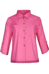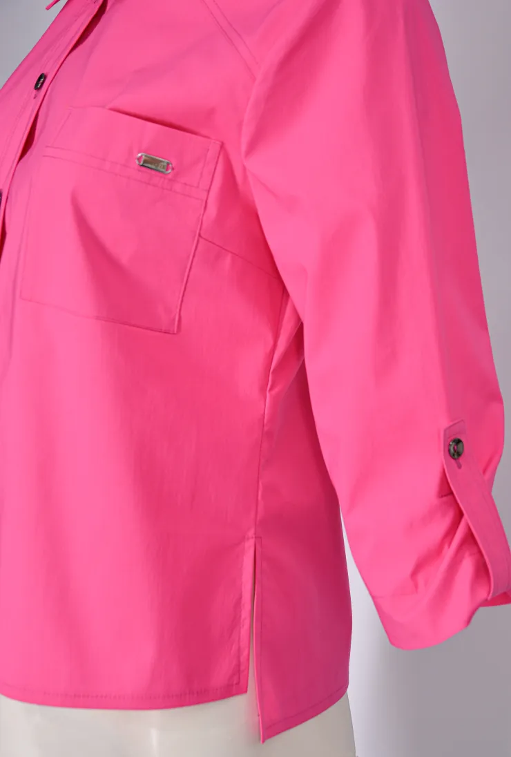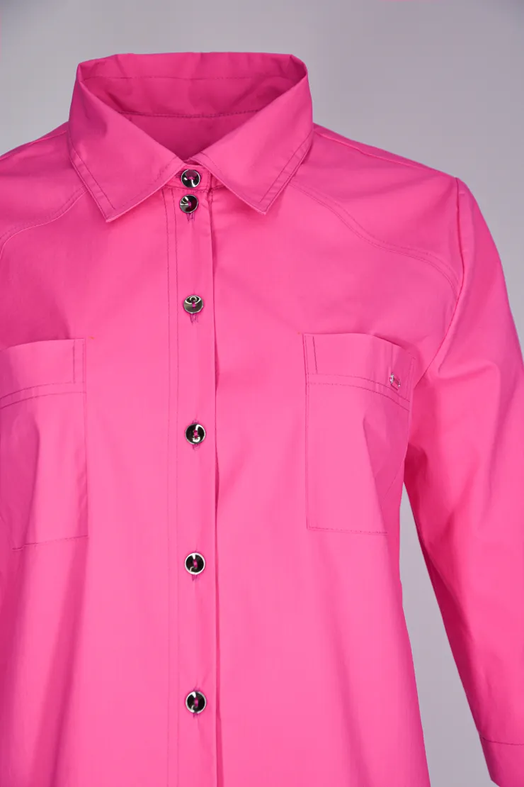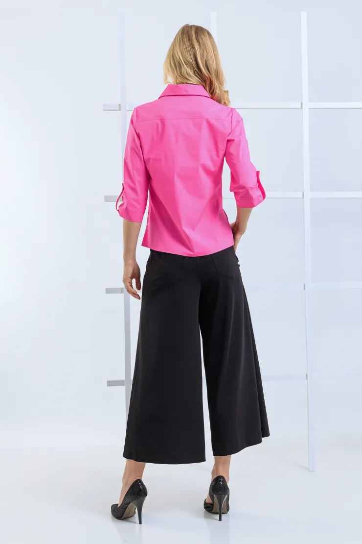 Komplet tvoří sytě růžová košilová halenka a široké černé splývavé culottes. Košilová halenka má přiléhavý střih, tříčtvrteční rukávy s knoflíkovými manžetami a dvěma náprsními kapsami. Střih halenky přirozeně zvýrazňuje pas a dodává sebevědomou siluetu. Černé culottes sahají ke lýtkům a svou splývavou látkou elegantně tvarují boky. Kontrast sytě růžové a matně černé vytváří výraznou, přesto vyváženou kombinaci vhodnou na obchodní schůzku i formální příležitost. Oba kusy jsou ušity ručně v krejčovské dílně v limitovaném počtu do 3 kusů od velikosti.