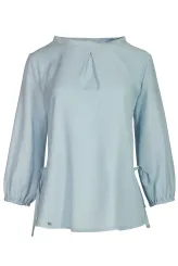 Světle modrá halenka ze splývavé tkaniny přirozeně obtéká postavu a dodává nositele ženský, sebevědomý vzhled. Stojáčkový límec jemně rámuje výstřih s centrálním nařasením, které opticky prodlužuje siluetu. Balonové rukávy jsou stahovány elastickým lemem u zápěstí a doplněny zavazovacím páskem pro dokonalé přizpůsobení. Volnější silueta zaručuje pohodlí po celý pracovní den bez kompromisů ve vzhledu. Jemně prosvítající tkanina s lehkou strukturou dodává modelu vzdušný charakter vhodný pro kancelář i formální příležitosti. Každý kus je vyroben s vysokým podílem ruční práce v krejčovské dílně v limitovaném počtu do 3 kusů od velikosti.
