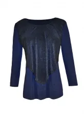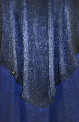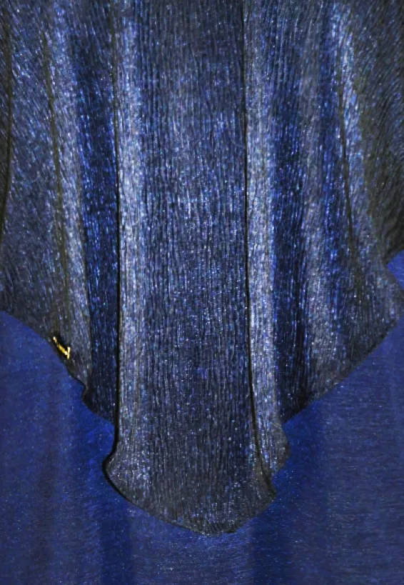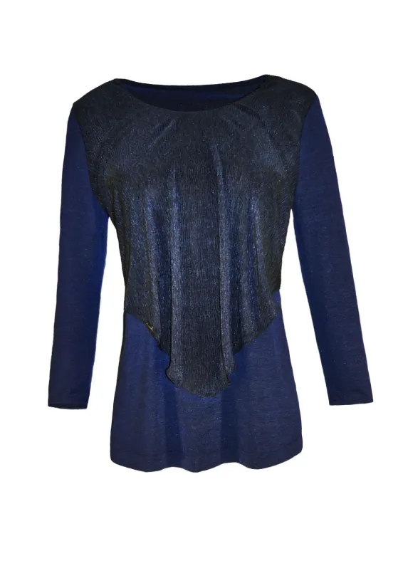 Tato tmavě modrá halenka s dlouhými rukávy spojuje dvě tkaniny do jednoho propracovaného modelu. Přední díl tvoří jemně lesklá splývavá látka s mírným řasením, která přirozeně tvaruje trup a zvýrazňuje ženskou siluetu. Boky a rukávy jsou řešeny v matné úpletové tkanině stejného odstínu, což vytváří harmonický kontrast. Kulatý výstřih rámuje dekolt uvolněně a žensky. Splývavý přední panel volně přechází do asymetrického cípu, který opticky prodlužuje postavu. Model je vyroben ručně v krejčovské dílně v limitovaném počtu do 3 kusů od velikosti.