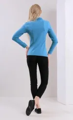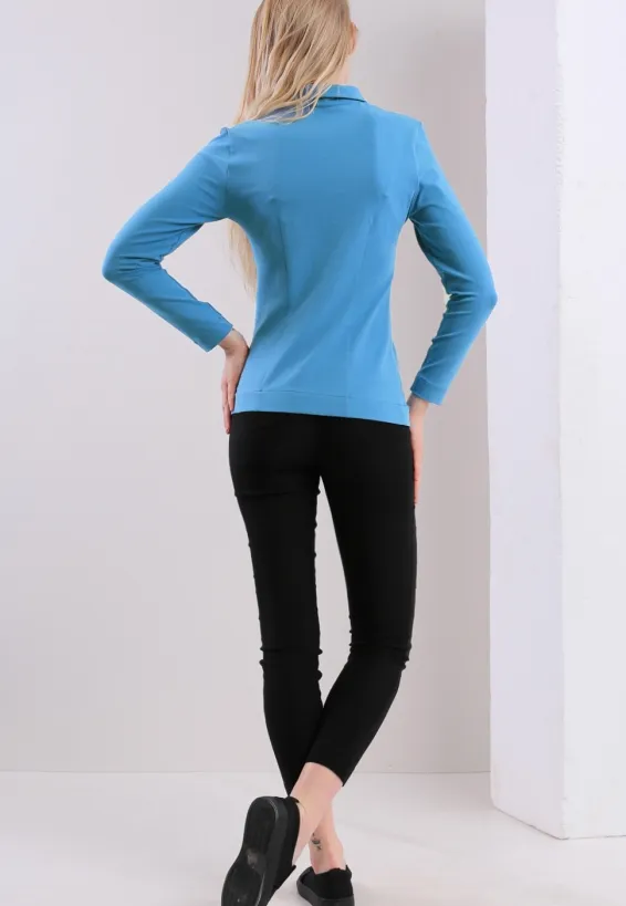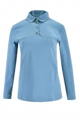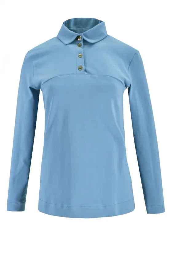 Světle modrá polo halenka s límečkem a třemi zlatými knoflíky působí uhlazeně a sebevědomě. Přiléhavý střih přirozeně kopíruje ženské křivky a zajišťuje pohodlný, reprezentativní vzhled po celý den. Límec polo rámuje dekolt a dodává modelu sofistikovaný charakter. Dlouhé rukávy s jemně staženými manžetami tvoří čistou, precizní siluetu. Spodní lem je zpevněný, což zajišťuje stabilní tvar a dokonalé padnutí. Model je vyráběn ručně v krejčovské dílně v limitovaném počtu do 3 kusů od velikosti.
