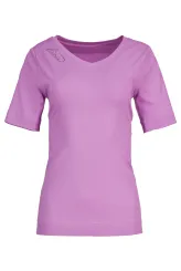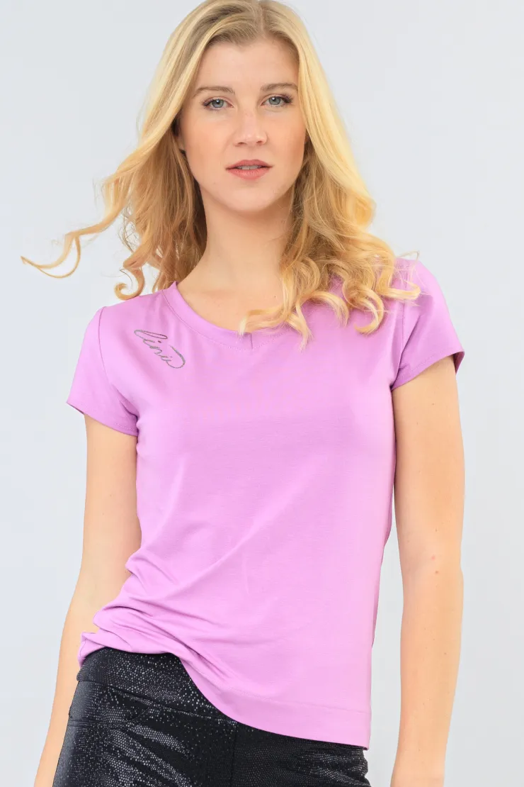 Pudrově fialové tričko s výstřihem do V působí sebevědomě a žensky po celý den. Přiléhavý střih přirozeně tvaruje postavu a zajišťuje pohodlné nošení od rána do večera. Výstřih do V jemně zvýrazňuje dekolt a dodává modelu sofistikovaný vzhled. Krátké rukávy sahají do poloviny paže a vizuálně prodlužují siluetu. Jemně lesklý nápis na hrudi doplňuje čistou linii modelu bez zbytečného zdobení. Model je vyroben ručně v krejčovské dílně v limitovaném počtu do 3 kusů od velikosti.