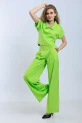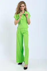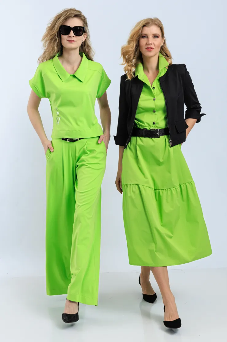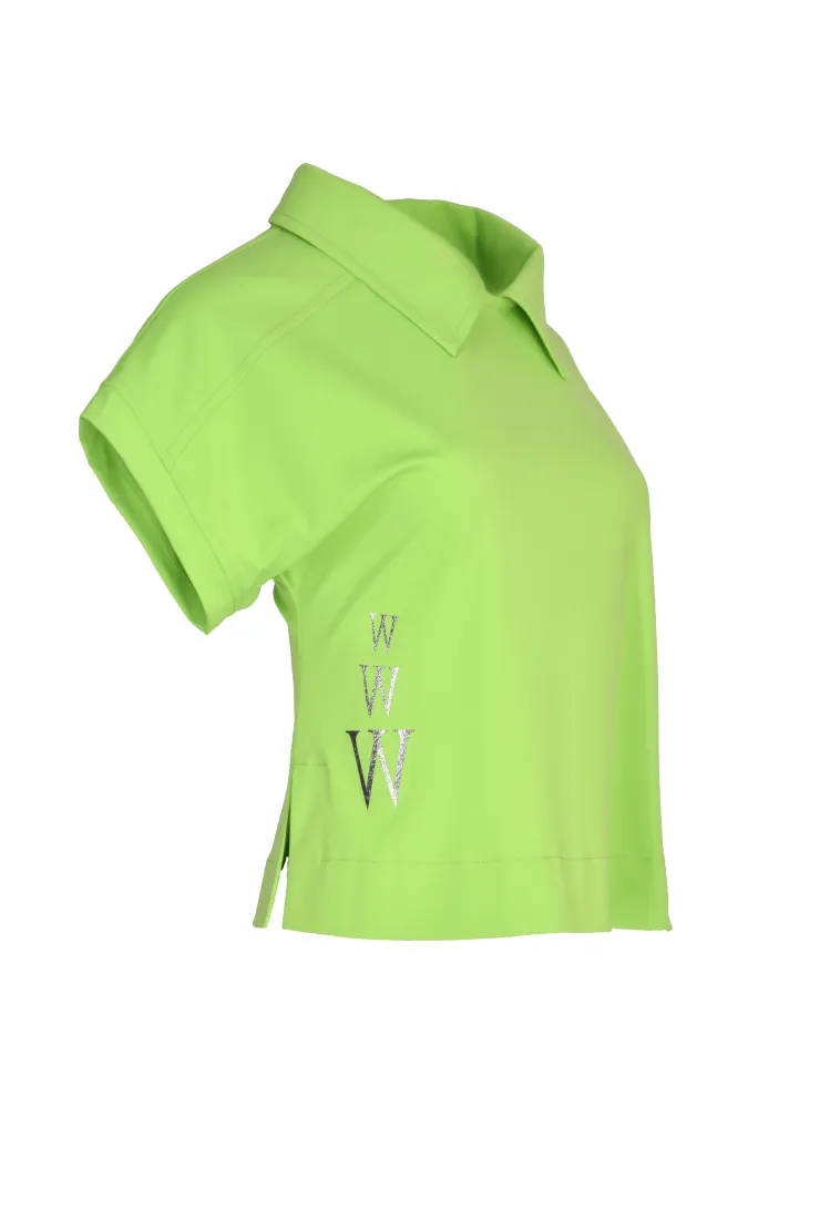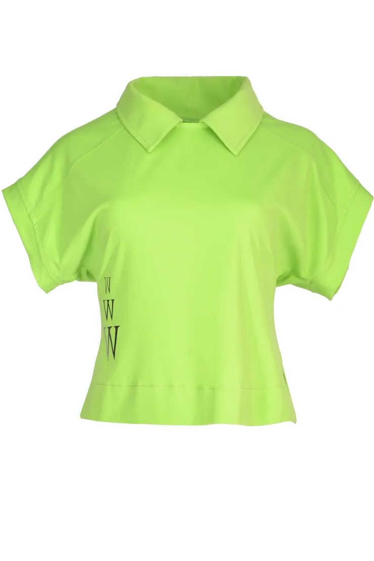 Tato neónově zelená halenka s klasickým límečkem přitahuje pozornost a dodává sebevědomý vzhled po celý den. Volný netopýří rukáv přirozeně obepíná ramena a vytváří vzdušnou, přesto tvarující siluetu. Zkrácený střih zvýrazňuje pas a dodává postavě lehkost a proporcionalitu. Klasický košilový límeček rámuje výstřih a propůjčuje modelu sofistikovaný charakter vhodný do pracovního prostředí. Na boku je diskrétně umístěn opakující se grafický motiv, který oživuje jinak čistou plochu tkaniny. Model je vyroben ručně v krejčovské dílně v limitovaném počtu do 3 kusů od velikosti.