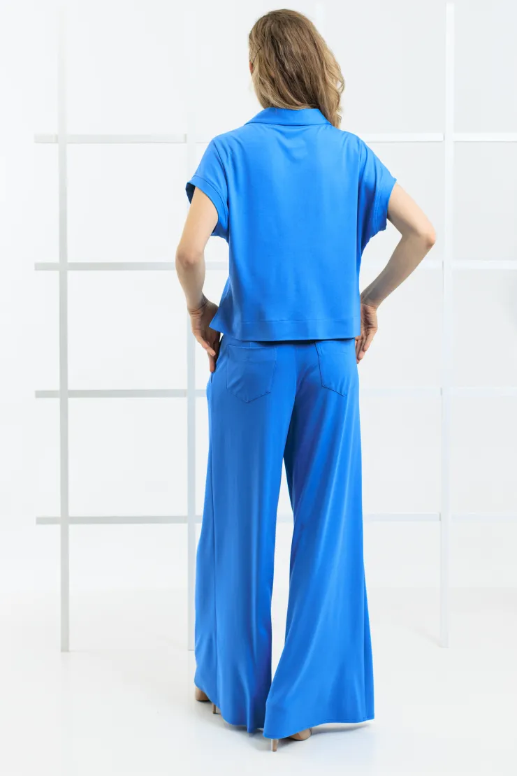 Komplet v královské modré barvě tvoří volná halenka s límečkem a široké splývavé kalhoty. Halenka s krátkými raglánovými rukávy a staženým spodním lemem přirozeně tvaruje pas. Široké kalhoty se šňůrkou v pase formují siluetu a zajišťují pohodlné nošení po celý den. Splývavá tkanina dodává pohybu přirozenou lehkost a žena se v modelu cítí sebevědomě. Kapsy na kalhotách spojují praktičnost s uhlazeným vzhledem. Model je vyroben ručně v krejčovské dílně v limitovaném počtu do 3 kusů od velikosti.