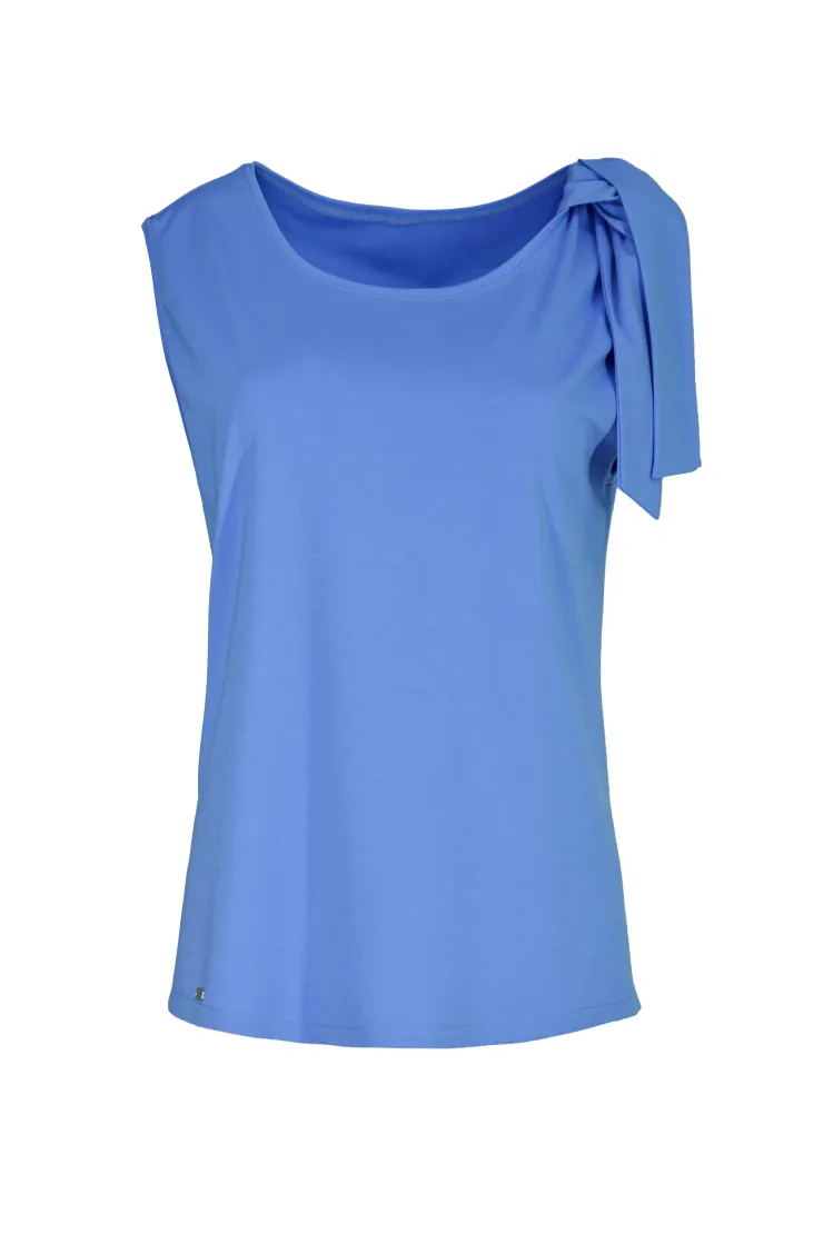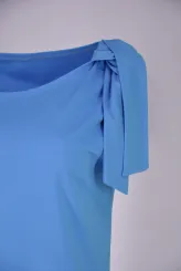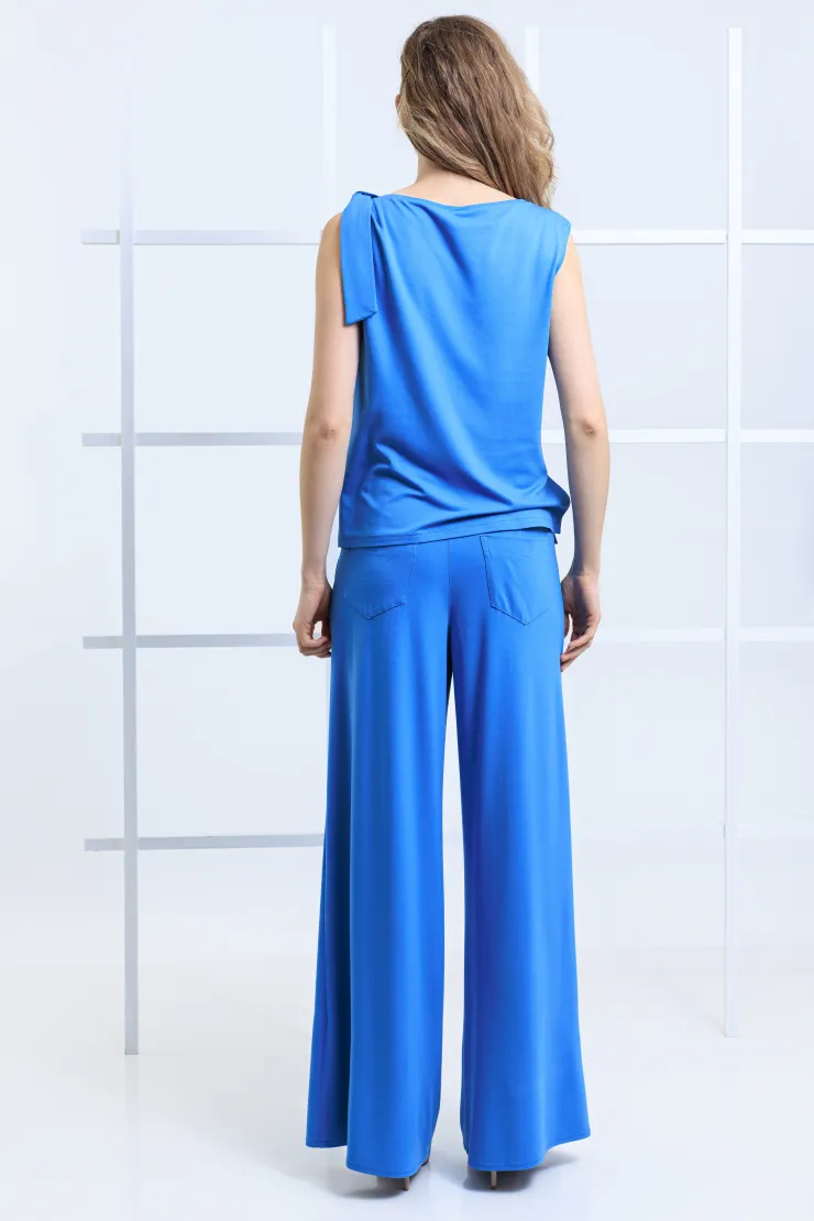 Kobaltově modrý komplet tvoří volná halenka a široké kalhoty s přímou nohavicí. Halenka je bez rukávů a na ramenou zdobena jemným vázáním v podobě uzlů. Splývavá tkanina přirozeně kopíruje postavu a zajišťuje pohodlí po celý pracovní den. Široké kalhoty s vysokým pasem vizuálně prodlužují siluetu a dodávají sebevědomý vzhled. Přední část kalhot je řešena překříženým záhybem, který jemně tvaruje boky. Model je vyroben ručně v krejčovské dílně v limitovaném počtu do 3 kusů od velikosti.