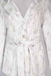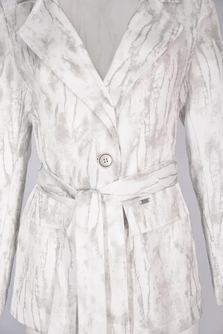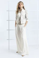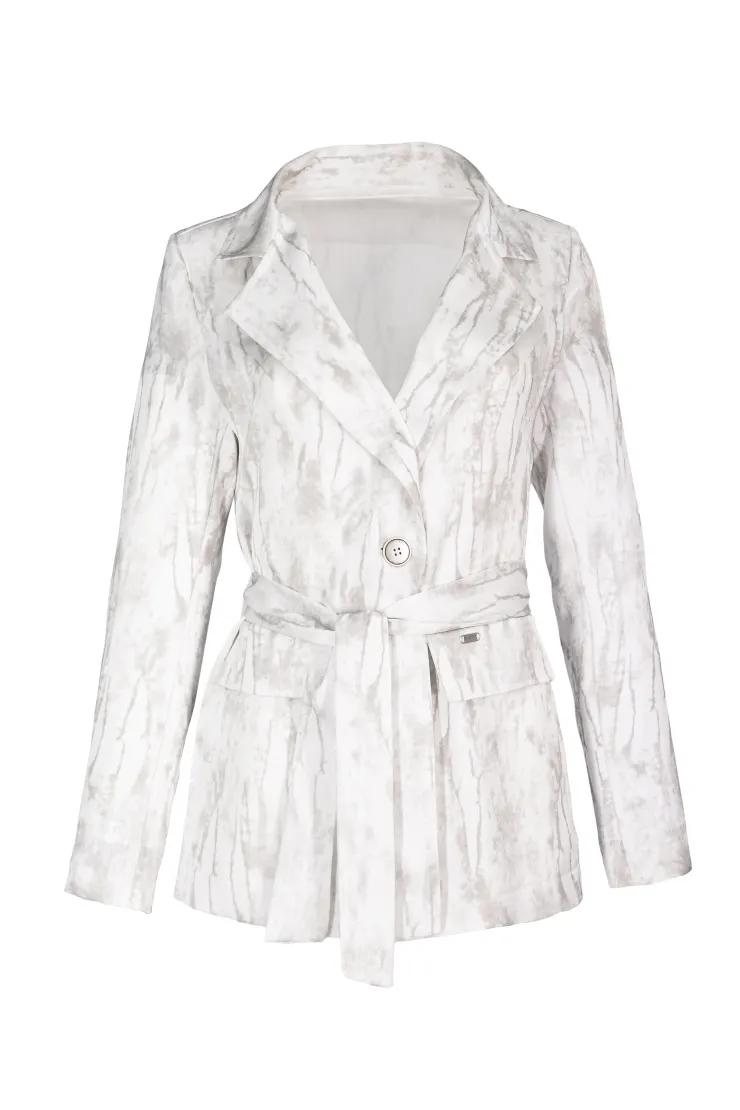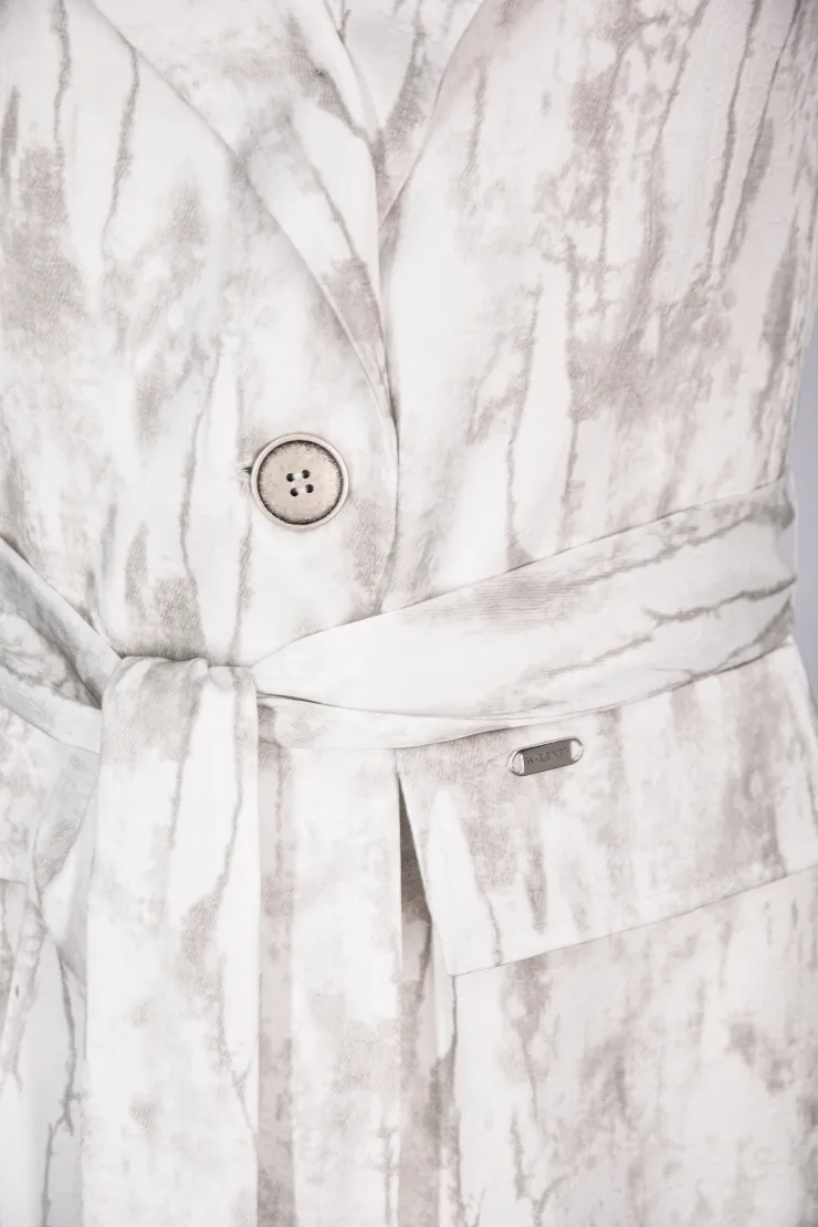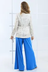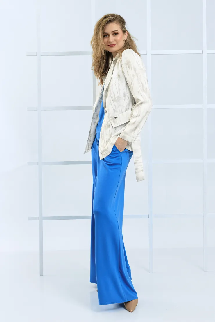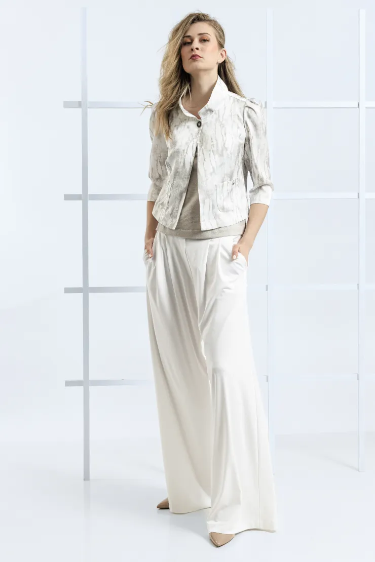 Tento krémový komplet spojuje vzorované sako s širokými splývavými kalhotami do ucelené siluety. Přímý střih kalhot s širokými nohavicemi opticky prodlužuje postavu a zajišťuje přirozený pohyb po celý den. Sako s výrazným vzorem v odstínech krémové a šedé tvaruje trup a dodává celku strukturu. Pod sakem je vrstvená pudrová halenka s volným výstřihem, která zjemňuje celkový výraz. Zapínání saka na dva knoflíky a boční kapsy dotváří střih s precizní péčí o každý tvar. Model je vyroben ručně v krejčovské dílně v limitovaném počtu do 3 kusů od velikosti.