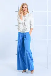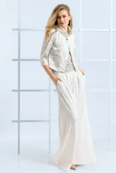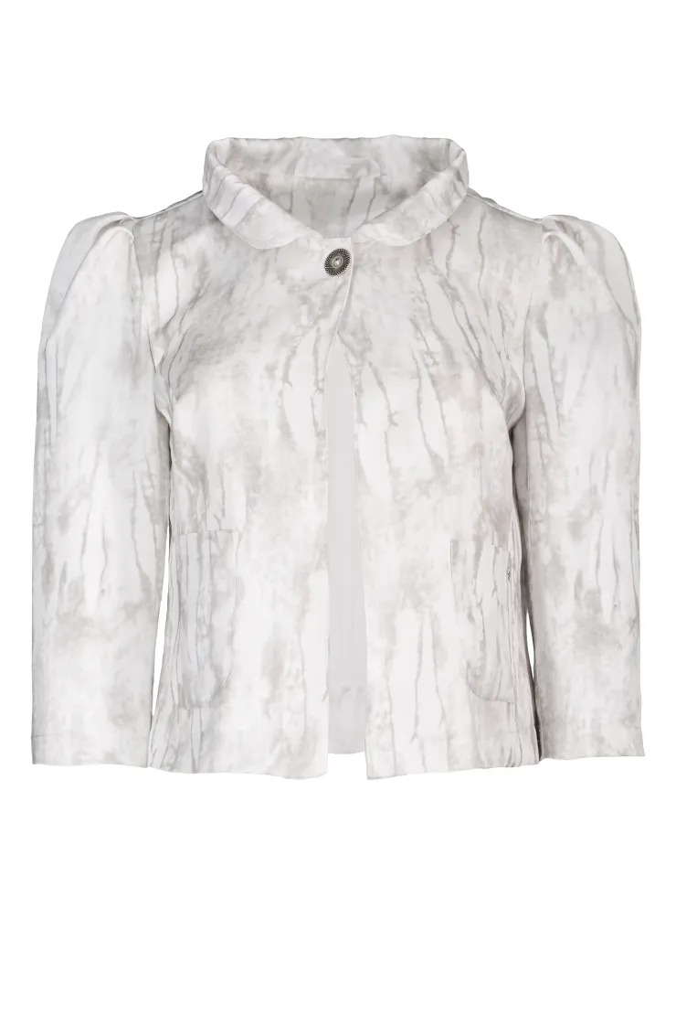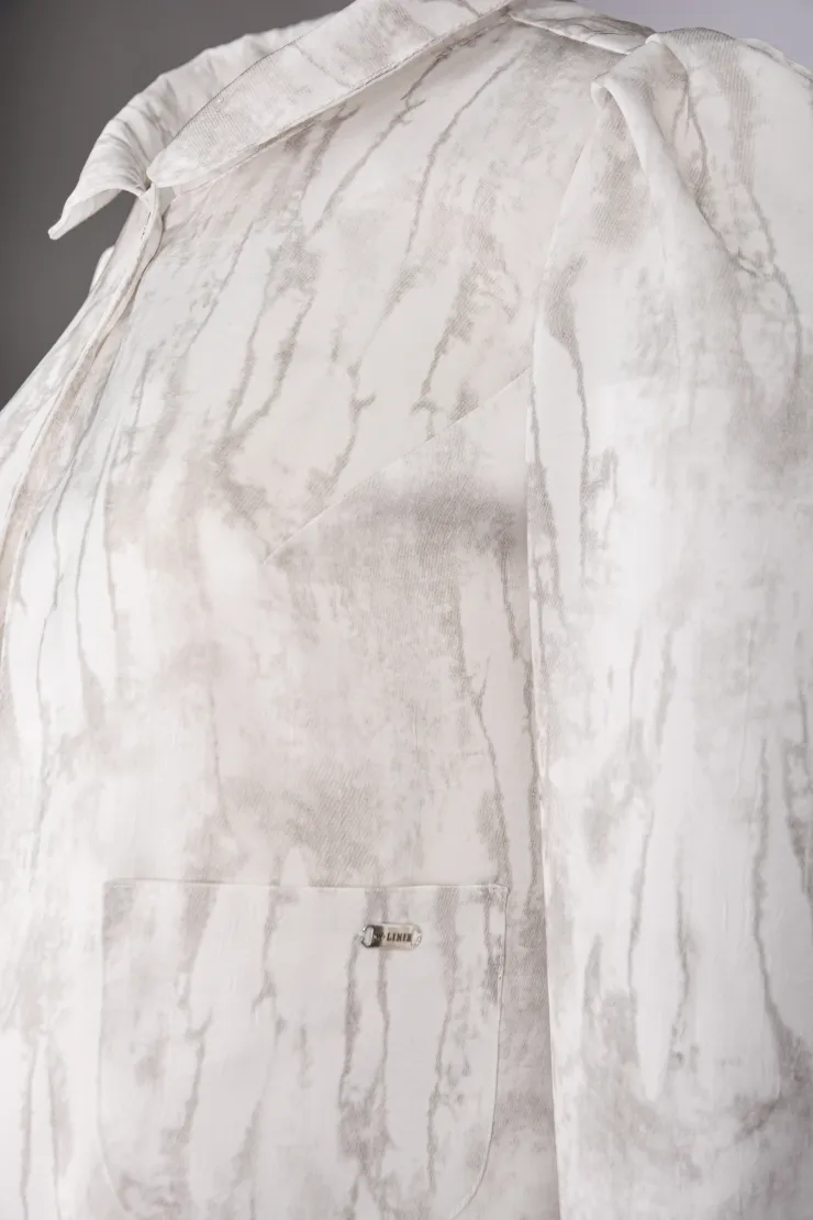 Tento krémový komplet spojuje splývavou maxi sukni s bundičkou z jemně vzorované tkaniny v tónech béžové a světle šedé. Bundička se stojáčkovým límcem a tříčtvrtečními rukávy přirozeně formuje horní část postavy a dodává sebevědomý vzhled. Zapínání na jeden knoflík uprostřed přední části tvoří čistý a uhlazeně působící prvek. Splývavá maxi sukně s kapsami volně obtéká postavu a zajišťuje pohodlí po celý pracovní den. Krémová barva sukně ladí s béžovým tónem bundičky a vytváří ucelenou, nadčasovou siluetu. Komplet je ušit ručně v krejčovské dílně v limitovaném počtu do 3 kusů od velikosti, což zaručuje jeho výjimečnost a precizní padnutí.
