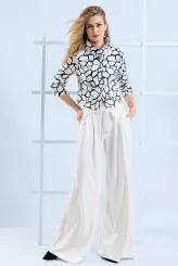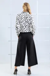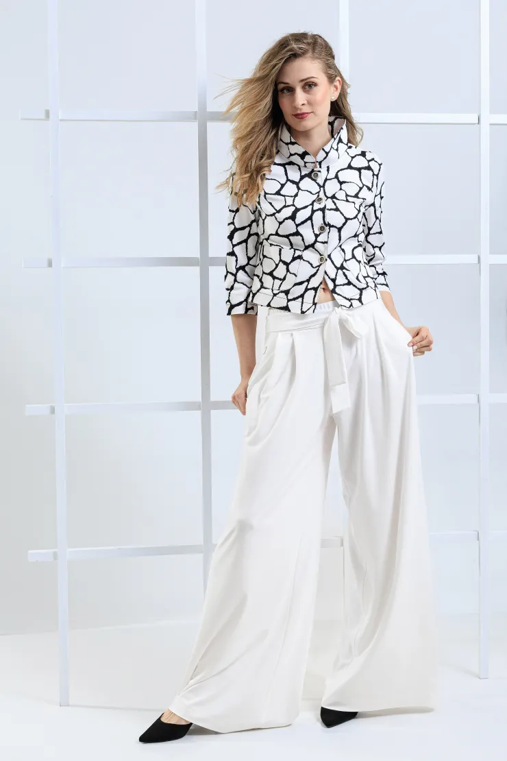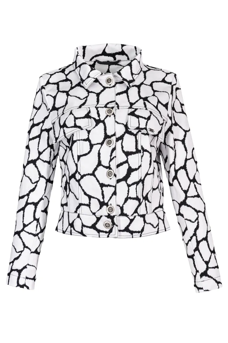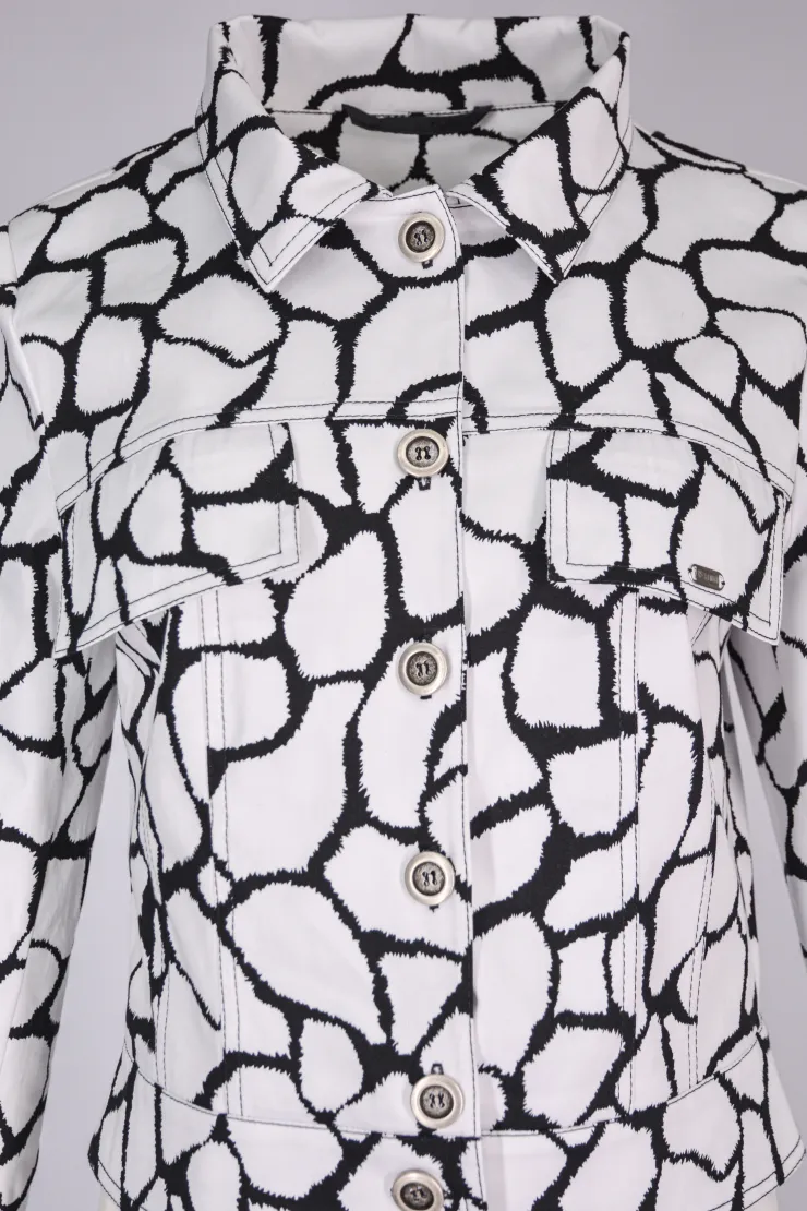 Přiléhavá bunda s výrazným černobílým grafickým vzorem přirozeně zvýrazňuje ženskou siluetu a dodává pocit sebevědomí. Živůtkový střih s rozšířenými rameny krásně formuje postavu a zajišťuje uhlazenou linii po celý den. Límec ve stojatém provedení rámuje výstřih a dodává modelu sofistikovaný charakter. Model je vyroben v krejčovské dílně s vysokým podílem ruční práce v limitovaném počtu do 3 kusů od velikosti.