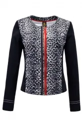 Kombinace čeného a vzorovaného úpletu, asymetricky vložený červený zip, černé lišty na předním díle a rukávech - a výsledkem je tento praktický podšitý kabátek do zaměstnání nebo na cesty.