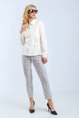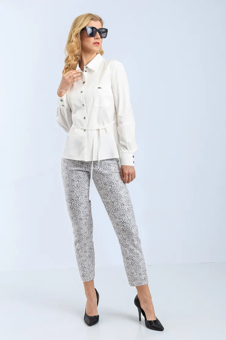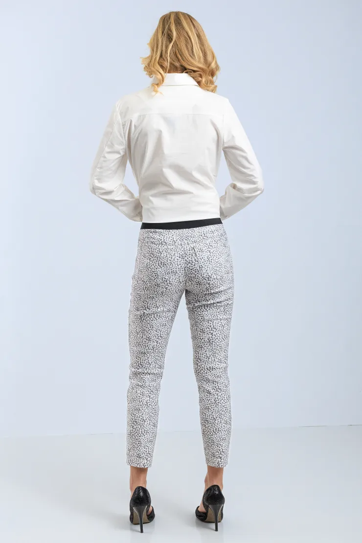 Přiléhavé kalhoty v bílém základu s nepravidelným šedým skvrnkovým vzorem působí sebevědomě a zároveň nenásilně. Jejich silueta přirozeně formuje postavu a zvýrazňuje ženské křivky po celý pracovní den. Černý elastický pas zajišťuje pohodlné nošení bez ztráty pevného tvaru. Přímý střih nohavic opticky prodlužuje postavu a dodává celkovému vzhledu uhlazenost. Zpracování probíhá ručně v krejčovské dílně, každá velikost je vyráběna v nejvýše třech kusech.
