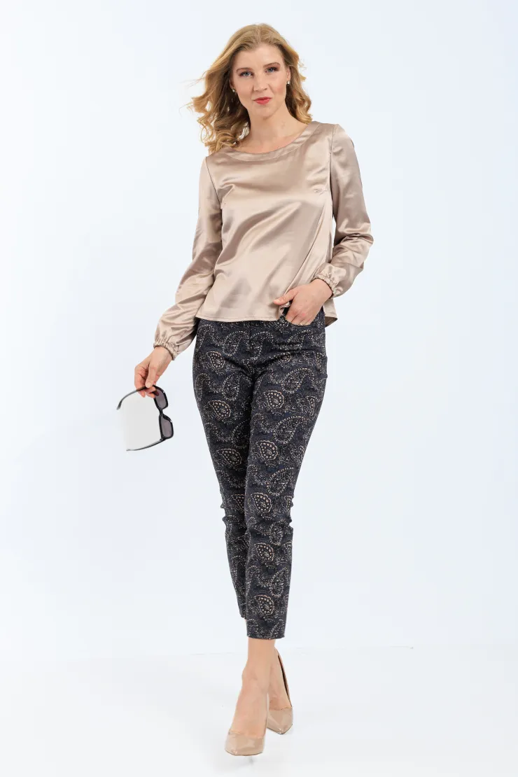 Tmavě modré kalhoty s jemně béžovým paisley vzorem zaujmou precizním střihem, který přirozeně formuje postavu. Širší pás v černém provedení pevně obepíná pas a vytváří uhlazenou siluetu. Přímý střih nohavic dodává postavě vyrovnanou, sebevědomou linii. Vzor kombinuje tmavě modré a béžové tóny, které spolu vytvářejí nadčasovou kompozici vhodnou do kanceláře i na obchodní jednání. Kalhoty jsou vyrobeny ručně v krejčovské dílně v limitovaném počtu do 3 kusů od velikosti. Prohlédněte si celou kolekci a najděte si svůj dokonalý model.