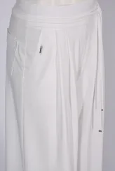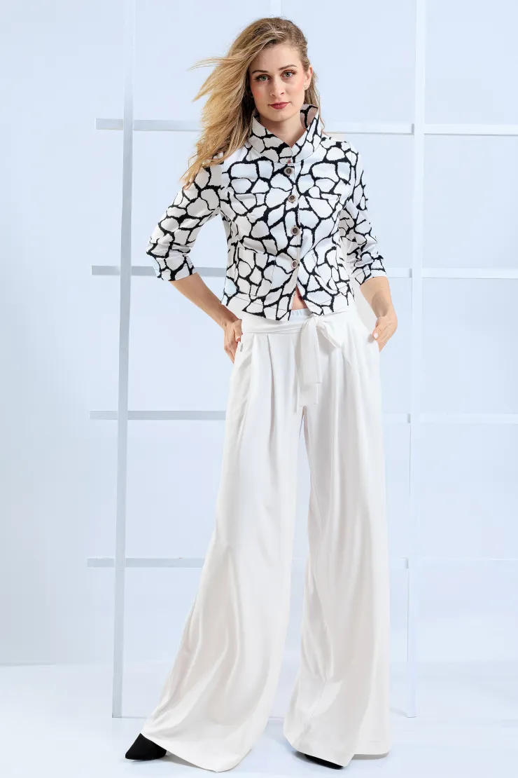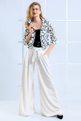 Tento světlý komplet tvoří splývavá maxi sukně a strukturované sako se žakárovým vzorem v krémově béžovém provedení. Sako se stojáčkovým límcem a tříčtvrtečními rukávy přirozeně tvaruje horní část postavy a dodává siluetě pevný, uhlazený tvar. Jednoknoflíkové zapínání v přední části saka vytváří čistou, symetrickou linii. Pod sakem je lehce viditelná vrstvená halenka v tlumené béžové barvě, která dotváří celkový vzhled. Splývavá maxi sukně s kapsami volně obtéká postavu a opticky prodlužuje siluetu. Kombinace žakárové tkaniny saka a splývavé látky sukně vytváří harmonický kontrast textury. Každý kus je šit ručně v krejčovské dílně a vyrábí se v limitovaném počtu do 3 kusů od velikosti.