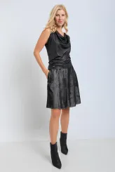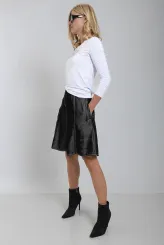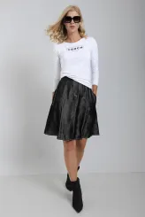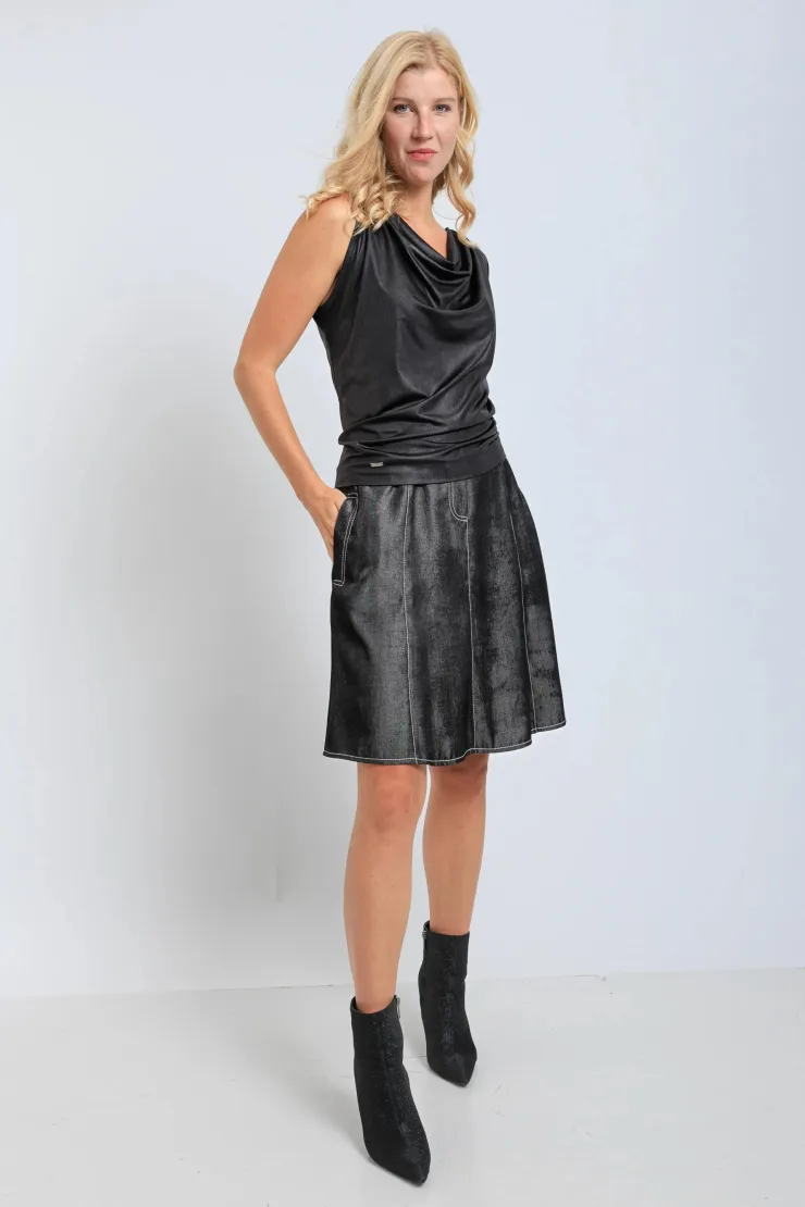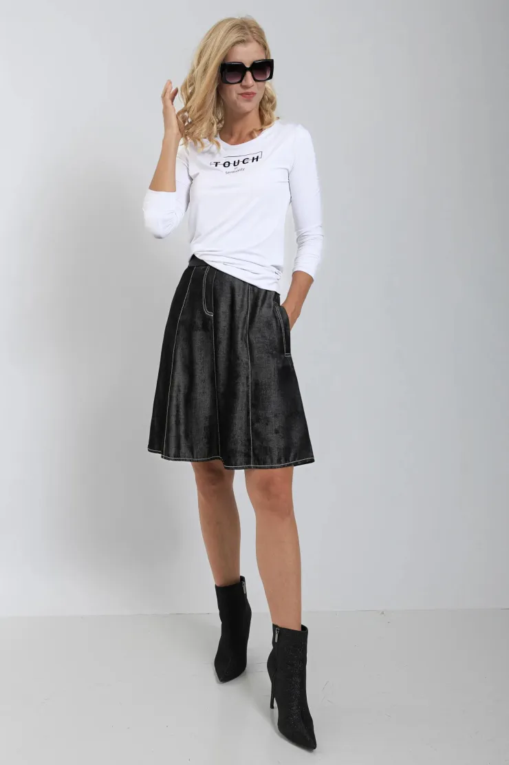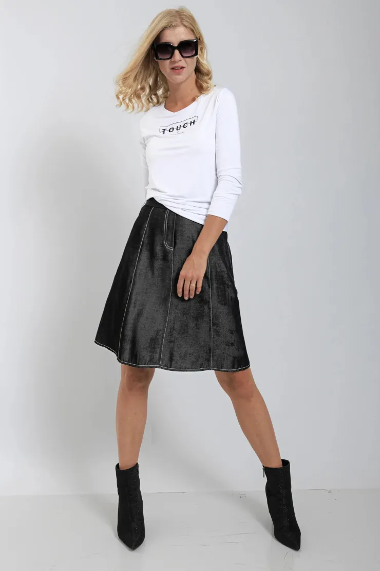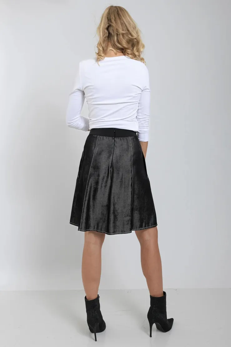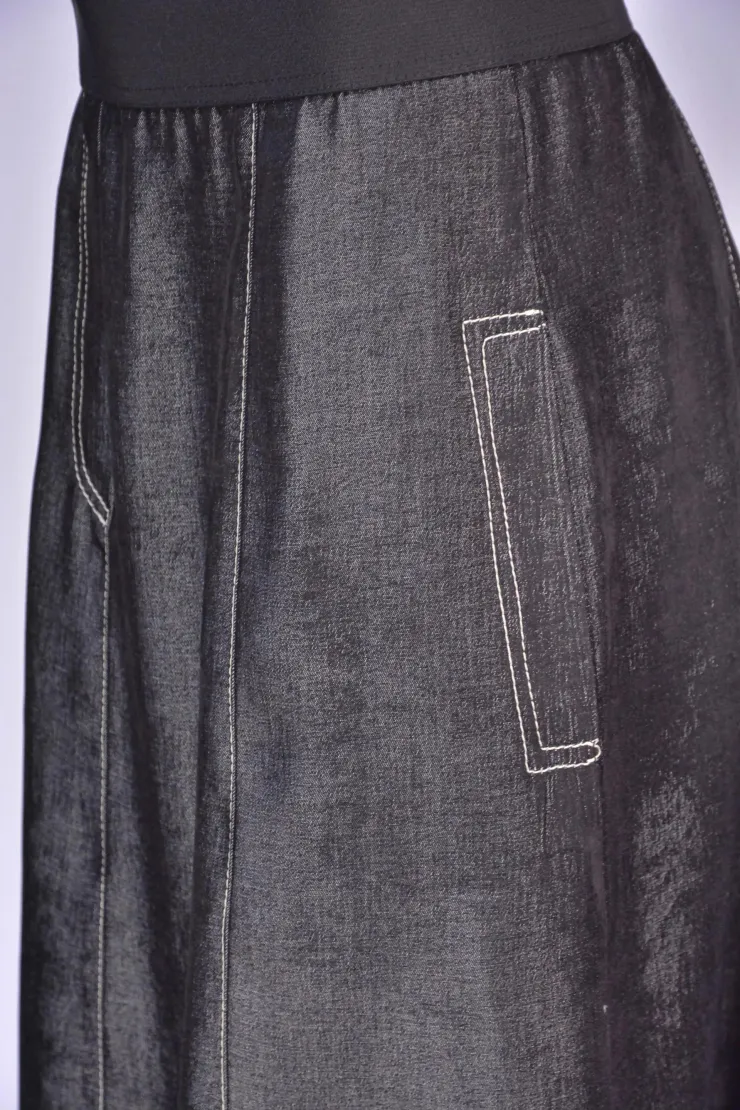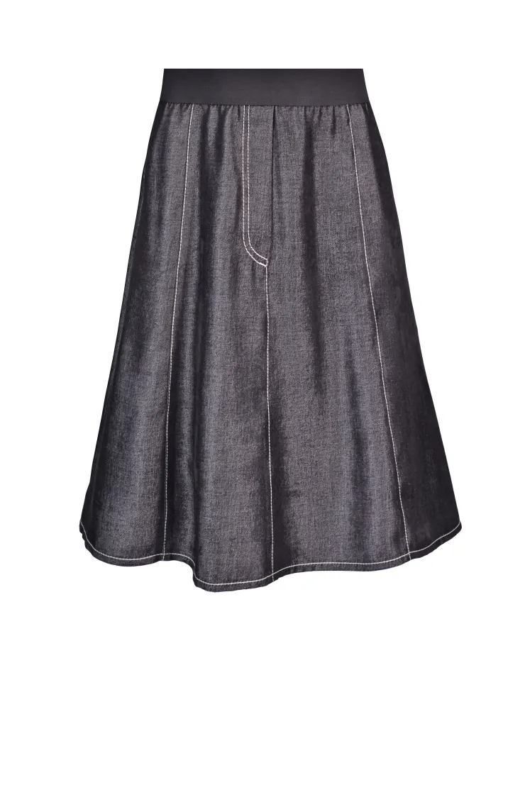 Rozšířená sukně z tmavého denimu přináší sebevědomý a uhlazený vzhled po celý den. Střih ve tvaru A-linie přirozeně formuje postavu a zajišťuje pohodlný pohyb. Kontrastní bílé prošití probíhá po celé délce sukně a tvoří výrazný designový prvek. Širší elastický pas v černé barvě pevně a pohodlně drží sukni na místě. Malá kapsa s bílým prošitím v přední části dodává modelu praktický i vizuální akcent. Midi délka sukně působí uhlazeně a je vhodná do kanceláře i na obchodní schůzku. Každý kus je ušit ručně v krejčovské dílně v limitovaném počtu do 3 kusů od velikosti.