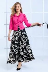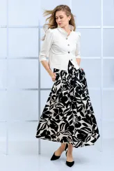 Tento komplet spojuje krémové sako se stojáčkovým límcem a tříčtvrtečními rukávy s rozšířenou sukní s výrazným listovým vzorem v černé a krémové barvě. Přiléhavé sako s knoflíkovým zapínáním přirozeně tvaruje pas a zvýrazňuje ženskou siluetu. Rozšířená sukně v délce pod kolena vytváří vzdušnou siluetu a zajišťuje svobodu pohybu po celý den. Listový vzor na sukni dodává celému kompletu výrazný charakter, který zaujme na každé obchodní schůzce. Sako je doplněno dvěma předními kapsami, které podtrhují promyšlenost střihu. Krémová barva saka čistě ladí s černobílou sukní a vytváří ucelený, nadčasový celek. Každý kus je šit ručně v krejčovské dílně v limitovaném množství do 3 kusů od velikosti.