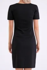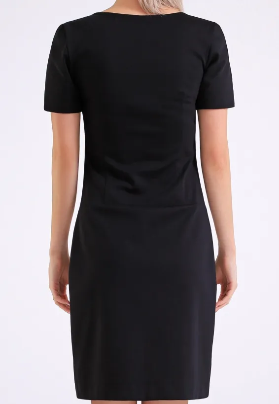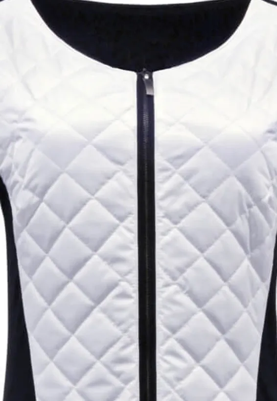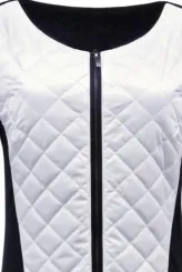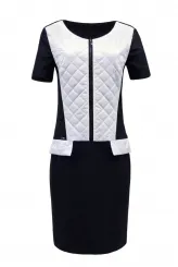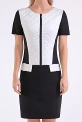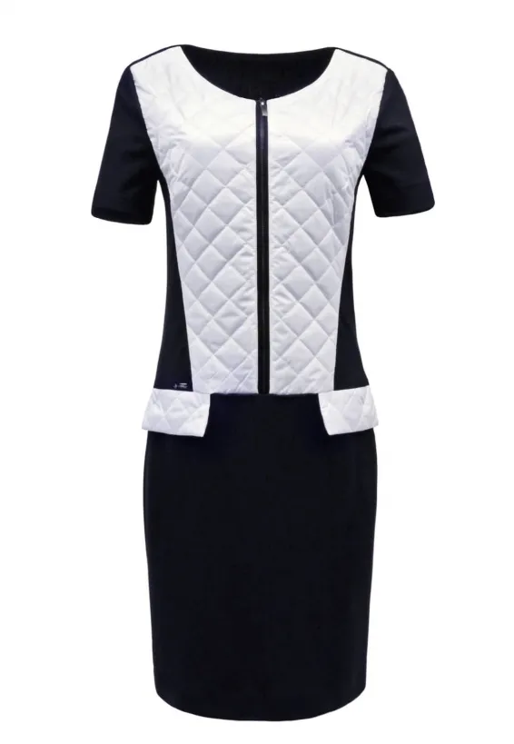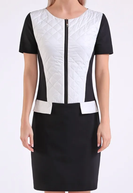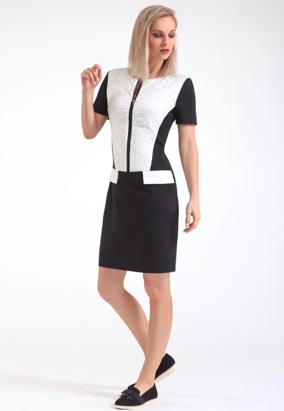 Pouzdrové šaty s výrazným bílým prošívaným předním dílem přirozeně tvarují postavu a dodávají sebevědomý vzhled po celý den. Přiléhavý střih zvýrazňuje ženské křivky a zajišťuje pohodlné nošení od rána do večera. Kulatý výstřih jemně rámuje dekolt a dodává modelu uhlazenou siluetu. Krátké rukávy v černém provedení kontrastují s bílým prošívaným předním dílem a vytvářejí přirozený důraz na horní část postavy. Zip probíhající po celé délce předního dílu tvoří čistý a výrazný designový prvek. Spodní část šatů je v černé barvě, která opticky protahuje postavu a dodává celkový dojem sebejistoty. Model je vyroben ručně v krejčovské dílně v limitovaném počtu do 3 kusů od velikosti.