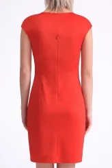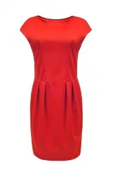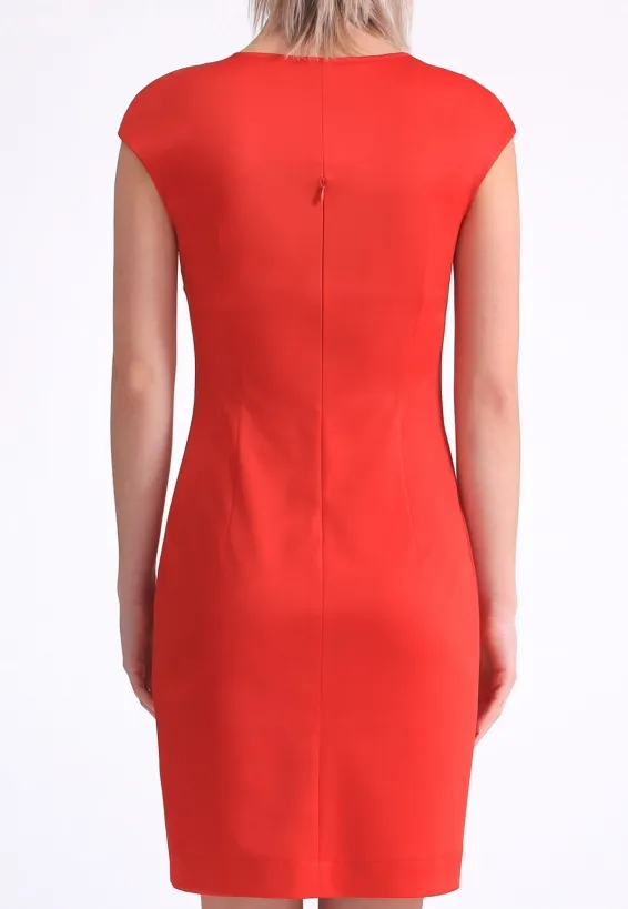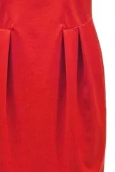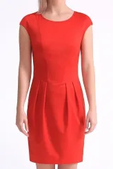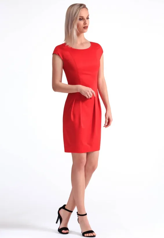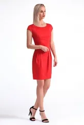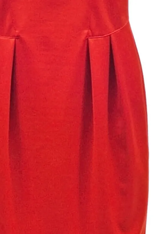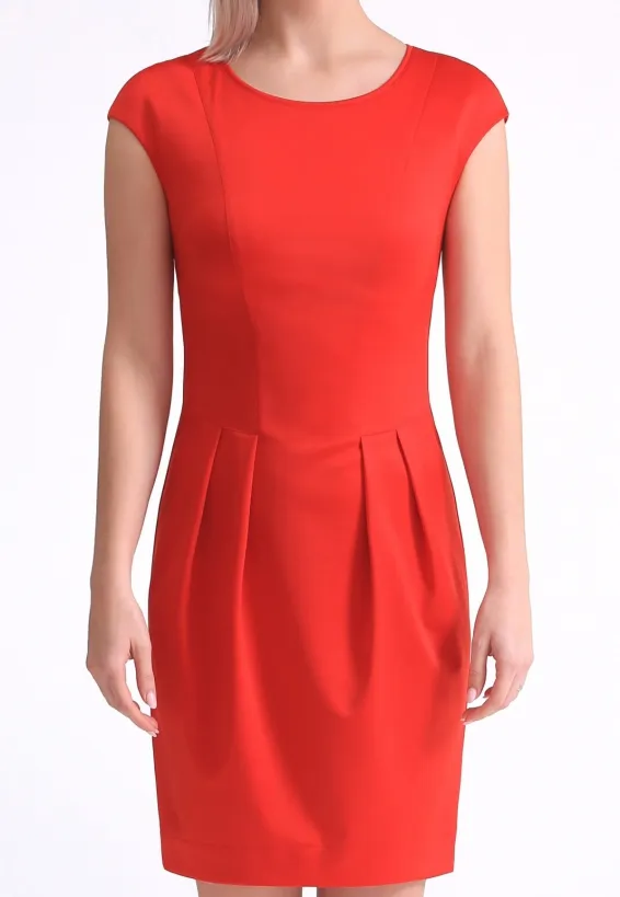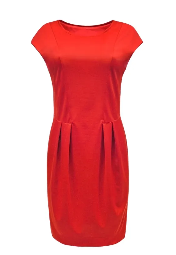 Červené šaty s jemně lesklým povrchem a kulatým výstřihem působí sebevědomě a žensky po celý pracovní den. Přiléhavý střih v oblasti pasu a boků přirozeně formuje postavu a vytváří vyváženou siluetu. Řasené záhyby na přední části sukně dodávají modelu živost a zároveň zajišťují volnost pohybu. Krátké vsazené rukávy rámují ramena a podtrhují uhlazený charakter modelu. Délka sukně ke kolenům zajišťuje vhodnost do kanceláře i na formální příležitosti. Každý kus je ušit ručně v krejčovské dílně ve velmi omezeném počtu do 3 kusů od velikosti.