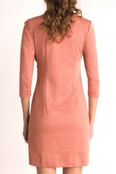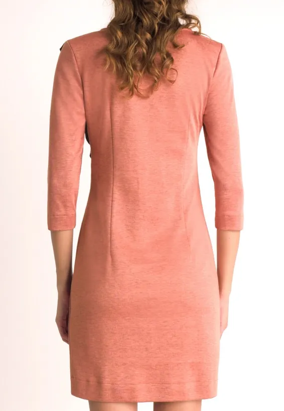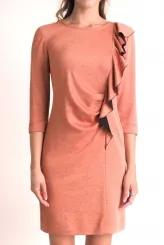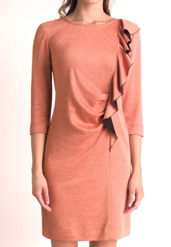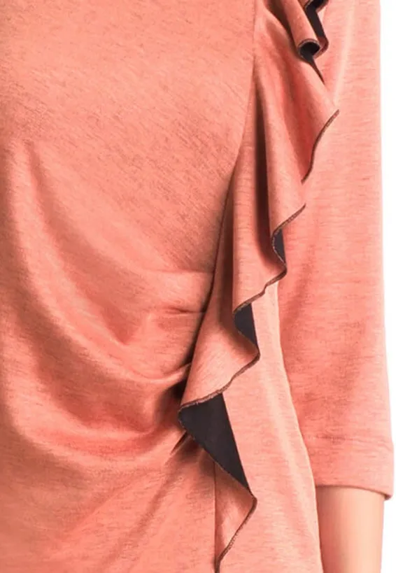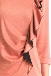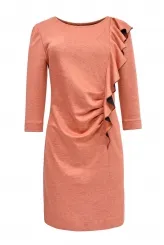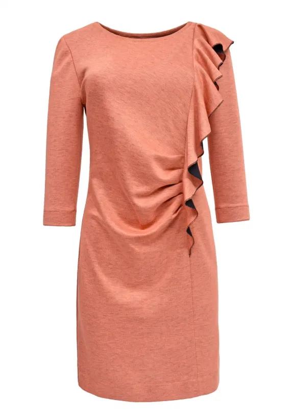 Lososové šaty s diagonálně vedeným volánem přirozeně zvýrazňují ženskou siluetu a dodávají sebevědomý vzhled po celý den. Volán probíhá od ramene k boku a vytváří opticky štíhlící linii, která ladně tvaruje postavu. Nařasení v přední části přidává objemový kontrast a podtrhuje ženské křivky. Lodičkový výstřih rámuje dekolt přirozeně a uhlazeně. Tříčtvrteční rukávy s čistou manžetou působí profesionálně a zároveň pohodlně. Splývavá tkanina v teplém lososovém odstínu je příjemná na dotek a zachovává tvar po celý den. Model je vyroben ručně v krejčovské dílně v limitovaném počtu do 3 kusů od velikosti.
