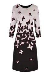 Tyto šaty s motýlím tiskem zaujmou přechodem světle šedé barvy do sytě černé, která vizuálně prodlužuje siluetu. Splývavý střih přirozeně tvaruje postavu a zajišťuje pohodlný střih po celý den. Tříčtvrteční rukávy dodávají modelu uhlazenost vhodnou do pracovního prostředí i na večerní příležitost. Kulatý výstřih rámuje dekolt nenápadně a přirozeně. Motýlí tisk je hustší v oblasti boků a dolního lemu, což opticky zeštíhluje pas. Model je vyroben ručně v krejčovské dílně v limitovaném počtu do 3 kusů od velikosti.