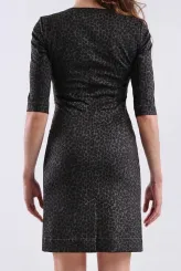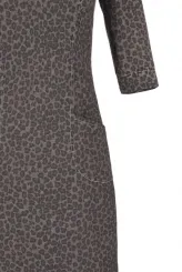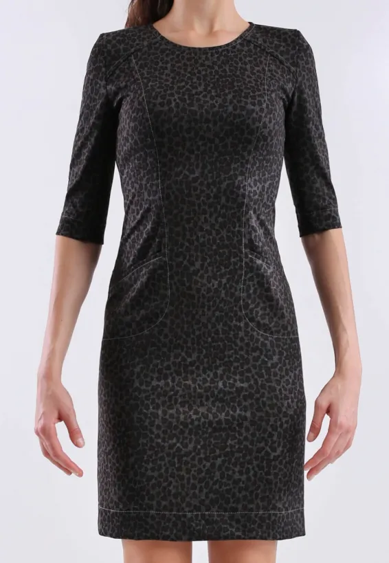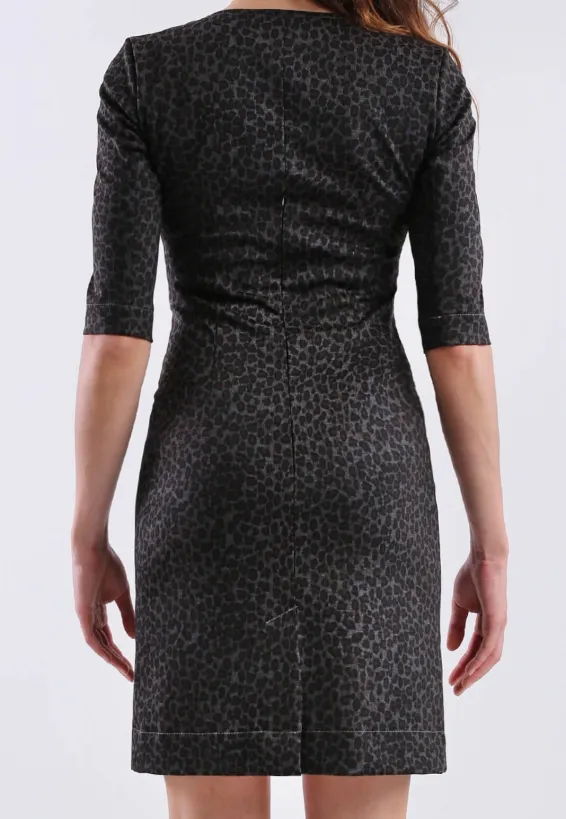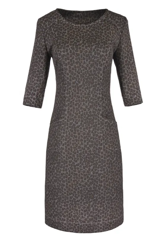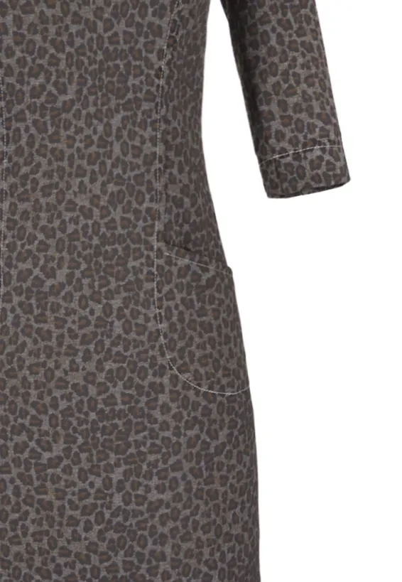 Šaty v šedohnědém leopardím vzoru kombinují přirozené tvarování postavy s celodenním pohodlím. Přiléhavý, ale volný střih vytváří ženskou siluetu bez zbytečné strnulosti. Kulatý výstřih rámuje dekolt nenápadně a uhlazeně. Tříčtvrteční rukávy s úzkými manžetami dodávají modelu propracovaný a soustředěný výraz. Dvě přední kapsy jsou začleněny do švů a zachovávají čistou linii předního dílu. Délka ke kolenům zajišťuje vhodnost pro kancelářské i společenské příležitosti. Každý kus je ušit ručně v krejčovské dílně v limitovaném počtu do 3 kusů od velikosti.