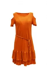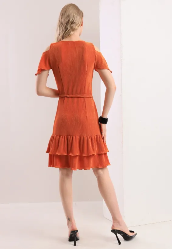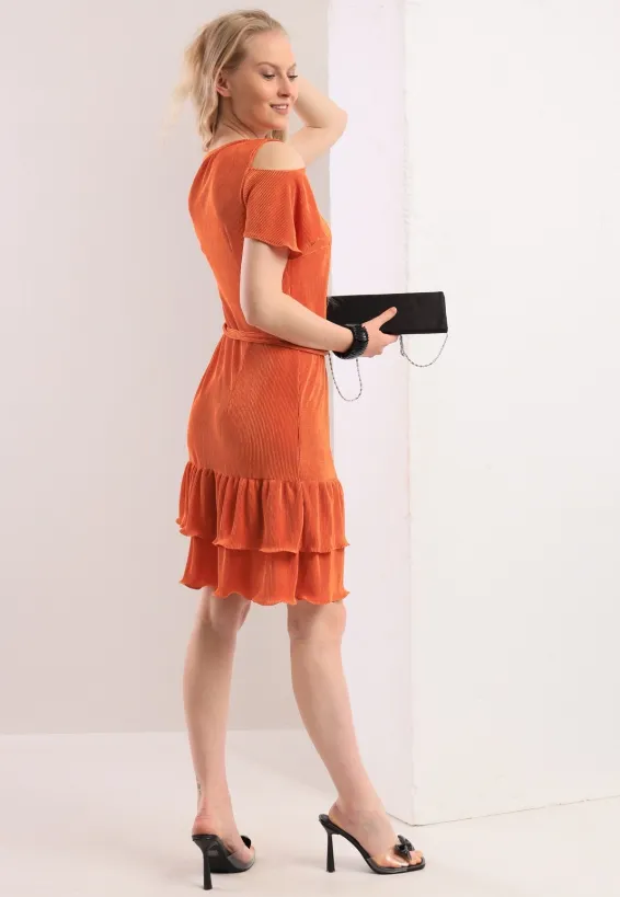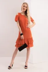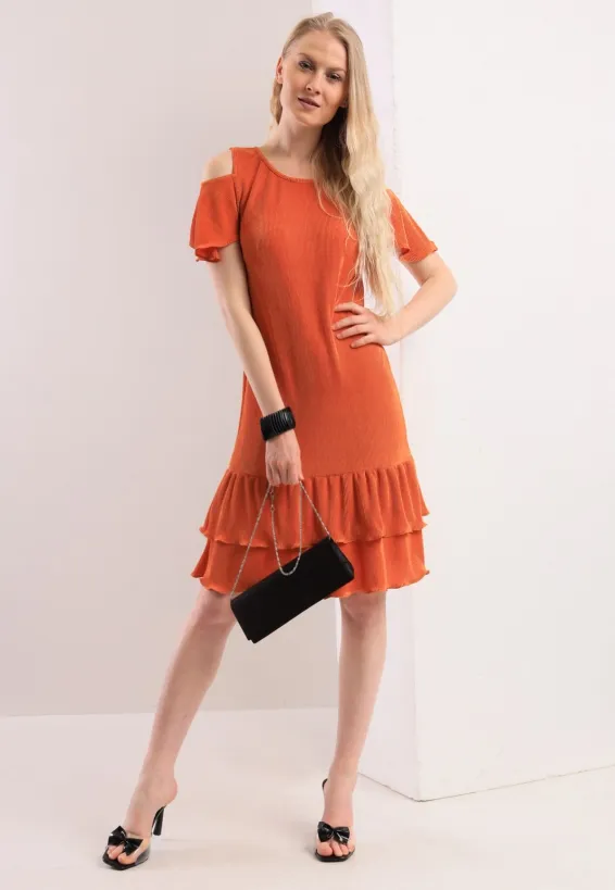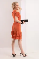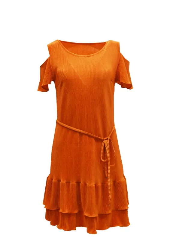 Žebrované šaty v sytě oranžové barvě přinášejí sebevědomý a ženský vzhled po celý den. Střih s odhalenými rameny a krátkými volánkovými rukávy jemně tvaruje horní část těla. Kulatý výstřih rámuje dekolt přirozeně a nenásilně. Dvojité nařásení na sukni vytváří hravou siluetu a vizuálně prodlužuje nohy. Textilní pásek v pase zdůrazňuje přirozenou linii postavy a lze jej uvázat podle potřeby. Sukně se záhyby sahá do výšky nad kolena a zajišťuje volnost pohybu. Model je vyroben ručně v krejčovské dílně v limitovaném počtu do 3 kusů od velikosti.