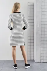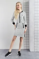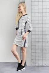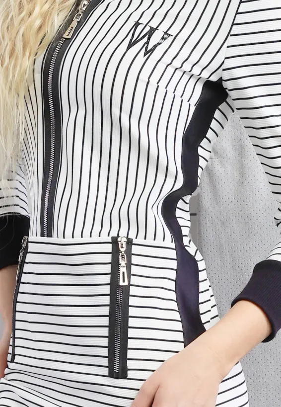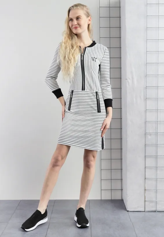 Tyto bílé šaty s černými proužky spojují sportovní siluetu s precizním střihem, který přirozeně tvaruje postavu. Vertikální proužky na horní části prodlužují siluetu a dodávají sebevědomý vzhled po celý den. Horizontální proužky na sukňové části vizuálně vyvažují proporce a podtrhují ženské křivky. Centrální zip probíhá po celé délce přední části a tvoří výrazný designový prvek. Dva boční zipy v oblasti pasu doplňují celkový vzhled a zvýrazňují přechod mezi živůtkem a sukní. Dlouhé rukávy s temnými úzkými manžetami a tmavý límec rámují postavu uhlazeně a působí uceleným dojmem. Model je vyroben ručně v krejčovské dílně v limitovaném počtu do 3 kusů od velikosti.