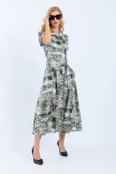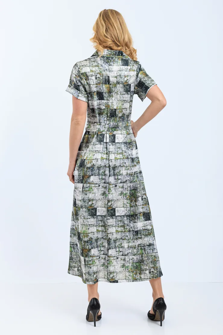 Košilové šaty s grafickým vzorem v odstínech zelené, šedé a bílé přitahují pohled přirozenou hrou barev. Rozevlátá midi sukně s páskem v pase zvýrazňuje ženskou siluetu a dodává sebevědomý vzhled. Klasický košilový límec a knoflíkové zapínání po celé délce přední části tvoří ucelený, promyšlený celek. Krátké rukávy s přeloženou manžetou dodávají modelu odlehčený, ale uhlazeně střižený charakter. Pásek v shodném vzoru zdůrazňuje pas a přirozeně tvaruje postavu. Model je ušit ručně v krejčovské dílně v limitovaném počtu do 3 kusů od velikosti.