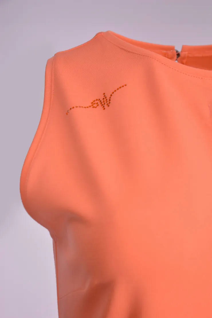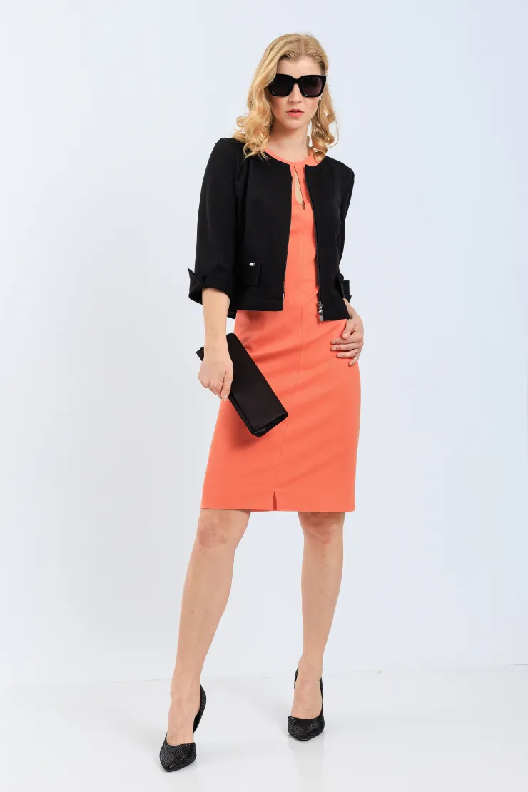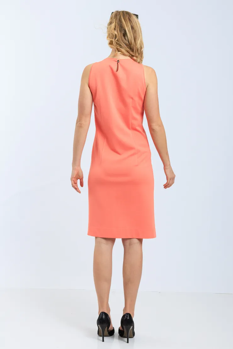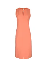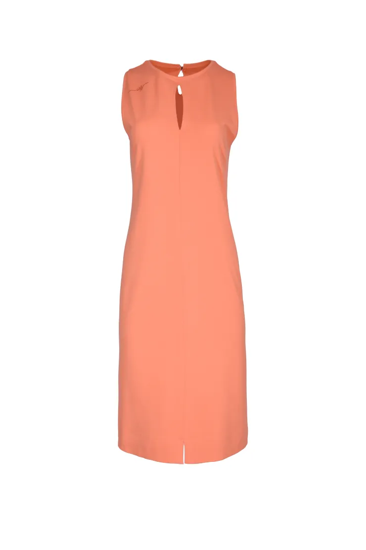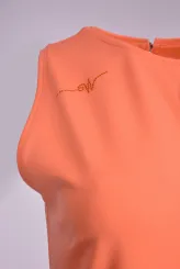 Pouzdrové šaty v teplé lososové barvě působí sebevědomě a žensky při každé příležitosti. Přiléhavý střih přirozeně tvaruje postavu a zvýrazňuje křivky bez omezení pohybu. Výstřih ve tvaru klíčové dírky dodává modelu jemnou hravost a vizuálně protahuje siluetu. Bez rukávů zůstávají ramena volná a celkový vzhled působí vzdušně. Přední rozparek u lemu umožňuje pohodlnou chůzi po celý pracovní den. Model je ušit ručně v krejčovské dílně v limitovaném počtu do 3 kusů od velikosti.